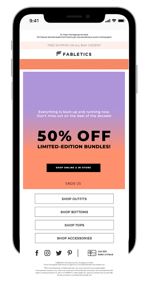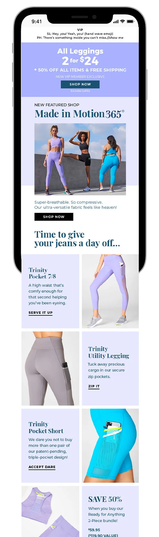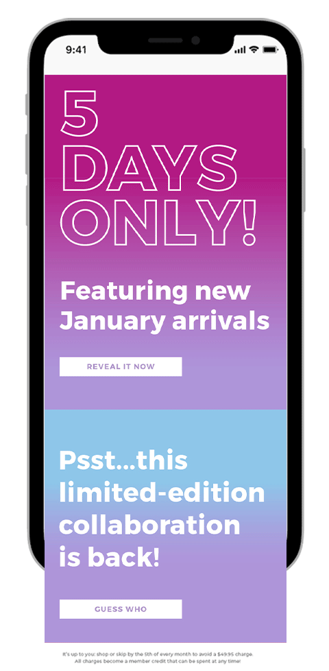 Another main focus was concepting and designing test e-mails. These were done quickly, without going through the typical rounds of review. Below are some samples I designed using bold type, color and motion. Results were integrated into new templates for regular e-mails.
