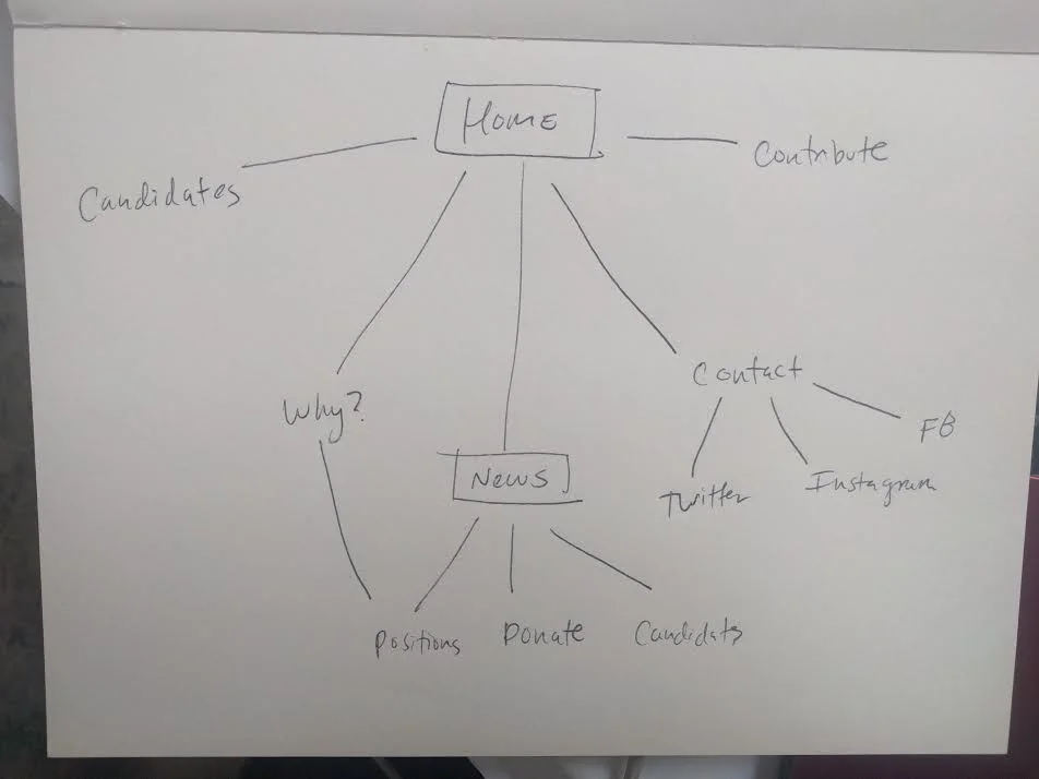 Because the party is new, minimal visual content exists. I selected stock photography and made illustrations to elevate the written content and tell the story of a a group in it's early stages. To start I used pen and paper to map out the site-structure before designing it in Sketch.