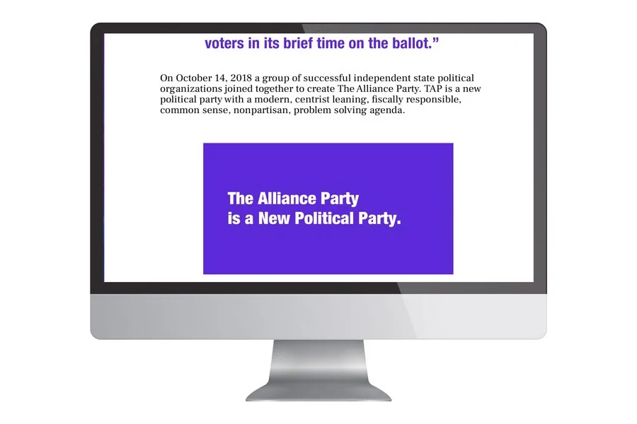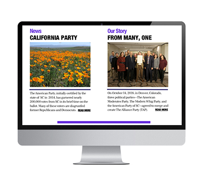 The Alliance Party, a new Political Party resulting from the merger of 9 independent parties, including ex Deomocrats and Republicans, approached me to design the user interface for their California website. One main goal was for it to be in alignment with their primary National site but have a "California" feel.