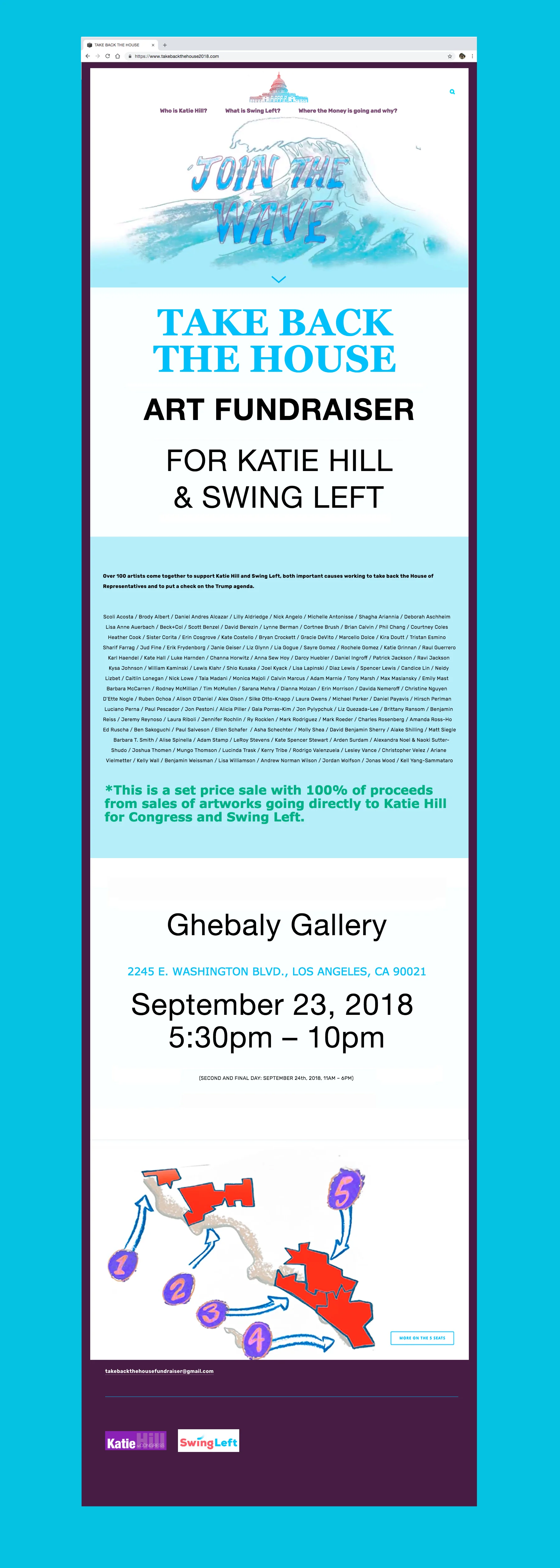 I designed and developed this website for a grass-roots fundraiser to raise money for Katie Hill for Congress and Swing Left. The goal was to create a promotional website for the fundraising event, as well as a place for the target audience (artists and art collectors) to read more about Katie Hill and Swing Left. My roles included creative direction and development of the website and digital assets.